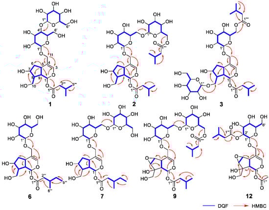 Important 2D NMR correlations observed for new compounds 1–3, 6, 7, 9, and 12.