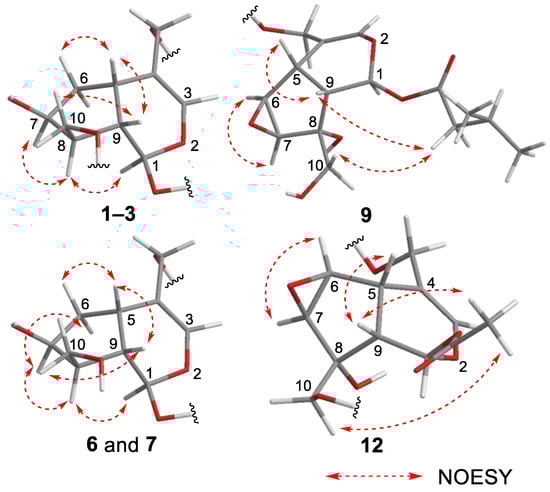 Important NOESY correlations observed for new compounds 1–3, 6, 7, 9, and 12.