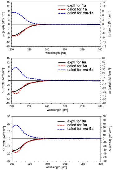 Experimental and calculated ECD spectra for 1a, 6a, and 9a.
