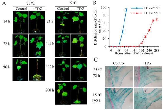 Effects of low temperatures on the abscission of cotton leaves treated with TDZ under different temperatures. (A) Representative images of cotton plants treated with thidiazuron (TDZ) or water (control) taken at 24, 72, and 96 h after treatment under 25 °C, and at 24, 144, 192, and 288 h after treatment under 15 °C; (B) defoliation rate (%) of cotton leaves at different time points after treatment. Error bars represent the SD of three biological replicates; (C) paraffin section observation of cotton AZs at 72 h after treatment under 25 °C and at 192 h after treatment under 15 °C. Scale bars are 200 µm. Cotton seedlings with the fifth true leaf fully expanded were used in the experiments.