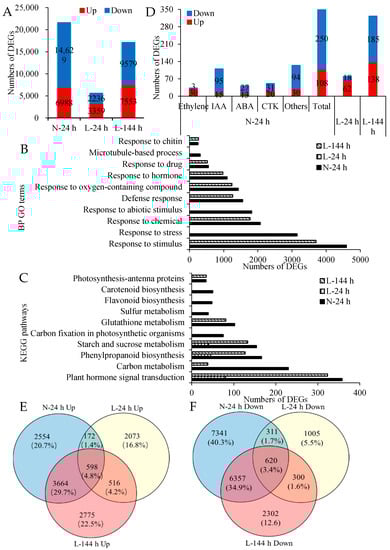 DEGs induced by TDZ (TDZ vs. control) in cotton AZs under different temperatures. (A) The numbers of DEGs in cotton AZs induced by TDZ. N-24 h, 24 h after treatment at normal temperature (25 °C). L-24 and L-144 h, 24 and 144 h, respectively, after treatment at low temperature (15 °C). The DEGs are controlled by q-value < 0.05 and |log2FC| ≥ 1. FC represents the expression-level fold change of genes. Black digits indicate the gene numbers; (B) enriched biological process GO terms (FDR (false discovery rate) < 0.001,). X-axis shows numbers of DEGs and Y-axis shows the top ten enriched GO terms of DEGs induced by TDZ at N-24 h; (C) enriched KEGG pathways (FDR < 0.05). X-axis shows numbers of DEGs and Y-axis shows the top-ten enriched KEGG pathways of DEGs induced by TDZ at N-24 h; (D) the numbers of plant signaling genes in cotton AZs regulated by TDZ; (E,F) Venn diagram displaying the number of DEGs unique to each time point or overlapping between different time points in AZs treated with TDZ compared with control. Upregulated DEGs (E). Downregulated DEGs (F). Black digits indicate the gene numbers. The percentage shows the proportion of DEGs of each part in all DEGs at three time points.