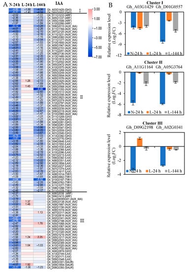 Among all DEGs in the plant hormone signal transduction pathway induced by TDZ, the number of indole-3-acetic acid (IAA) genes was the highest, and TDZ mainly downregulated their expression. However, these downregulated IAA-signaling genes presented different responses to low temperatures. Therefore, according to the response speed of genes to low temperatures, 95 downregulated IAA-signaling genes induced by TDZ at N-24 h could be divided into three clusters (Figure 3, Table S4). Among them, two IAA-signaling genes (two GH3 (Gretchen Hagen 3) genes) appeared at three time points indicating the two GH3 genes rapidly responded to TDZ at low temperatures (cluster I); 65 IAA-signaling genes appeared at N-24 and L-144 h indicating they slowly responded to TDZ at low temperatures (cluster II), and they contained 4 ARFs (auxin-response factor), 33 AUX/IAAs (auxin/indole-3-acetic acid), 9 GH3s, 12 LAXs (LIKE-AUX), and 7 TIR1s (transport-inhibitor response 1); and 28 IAA-signaling genes only appeared at N-24 h (cluster III) and they contained 2 ARFs, 19 AUX/IAAs, 1 GH3, 3 SAURs (small-auxin upregulated RNAs), and 3 LAXs (Figure 3A). Two genes from each cluster were selected to present the expression patterns with real-time quantitative PCR (RT-qPCR) (Figure 3B), and the expression of the six IAA-signaling genes indicated by RT-qPCR agreed well with the RNA-seq data. The results indicate that the majority of the downregulated IAA-signaling genes induced by TDZ are affected by low temperatures, and genes obtained from the same family have different sensitivity to low temperatures.