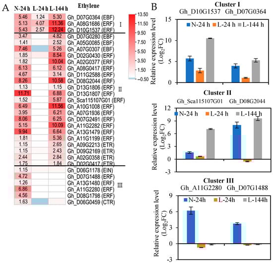 TDZ mainly upregulated the expression of ethylene-signaling genes. A total of 30 upregulated ethylene-signaling genes induced by TDZ at N-24h were also divided into three clusters, according to the response speed of the genes to low temperatures (Figure 4, Table S5). A total of three ethylene-signaling genes (one EBF (EIN3-BINDING F-BOX) and two ERF (ethylene-response factors) genes) appeared at three time points (cluster I); 21 ethylene-signaling genes (3 EBF, 4 ETR (ethylene receptors), and 14 ERF genes) appeared at N-24 and L-144 h (cluster II); and six ethylene-signaling genes (one EIN3 (ethylene insensitive 3), one CTR1 (constitutive triple response 1), and four ERF genes) only appeared at N-24 h (cluster III) (Figure 4A). The expression patterns of two genes obtained from each cluster with RNA-seq and RT-qPCR (Figure 4B) were similar. The results indicate that low temperatures also affect the majority of TDZ-induced upregulated ethylene-signaling genes.