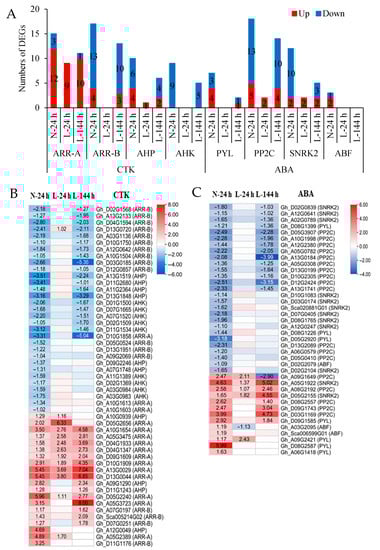 ABA-signaling genes (PYL, PP2C, SNRK2, and ABF) were induced by TDZ (Figure 5A,C, Table S7). PYL and ABF were mainly upregulated, while SNRK2 and PP2C genes were mainly downregulated in AZs treated with TDZ. Apart from the upregulated SNRK2 and PP2C genes, the other genes were not induced by TDZ at L-24 h. At L-144 h, approximately 50% of DEGs were induced by TDZ, but the expressions of ABF, PYL, and downregulated SNRK2 in AZs treated with TDZ were significantly inhibited by low temperatures.