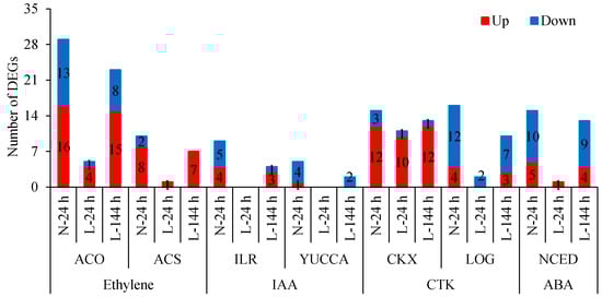 The ABA-synthesis gene (NCED) was mainly downregulated in AZs treated by TDZ, and only 1 gene appeared at L-24 h and 13 genes appeared at L-144 h (Figure 6). This indicated that the NCED gene was affected by the low temperature, but this effect decreased with the extension of the treatment time.
