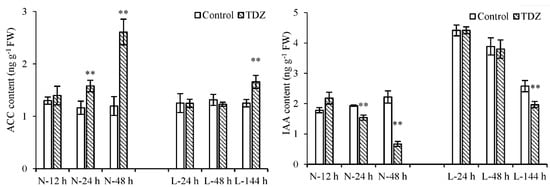 The contents of ACC and IAA in cotton AZs treated with TDZ and water (control) at different temperatures. Error bars represent the SD of three biological replicates. ** p < 0.01, Student’s t-test.