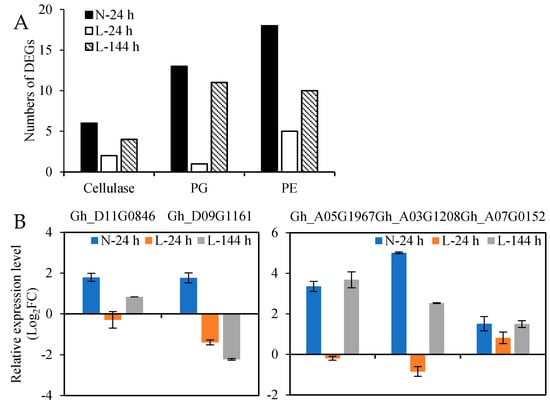 The third stage of the abscission process is the degradation of the cell wall and intercellular matrix; therefore, the upregulated cell wall hydrolase genes induced by TDZ might play important roles in this process. A total of 6 cellulase genes, 18 PE genes, and 13 PG genes were upregulated in AZs treated with TDZ at N-24 h, and most of them were affected by the low temperature. Among them (Figure 8A), eight genes (two cellulase, one PG, and five PE) were upregulated at L-24 h, and 25 genes (4 cellulase, 11 PG, and 10 PE) were upregulated at L-144 h. Five cell wall hydrolase genes were selected for RT-qPCR analysis (Figure 8B), and the results are consistent with the RNA-seq data. From the results, we can observe that 4 cellulase, 11 PG, and 6 PE genes slowly respond to TDZ at low temperatures, which might affect the time of AZs’ cell separation; one PG and seven PE genes were only upregulated in AZs treated with TDZ at normal temperatures, which might affect the defoliation rate of leaves under low temperature conditions (Table S8).