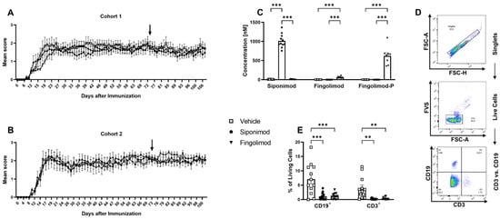 Development of experimental autoimmune encephalomyelitis in different treatment cohorts and validation of treatment success. Female C57BL/6J mice (9–12 weeks old) were immunized with MP4. (A,B) Disease course in two independent EAE cohorts. Arrows mark the beginning of siponimod or fingolimod treatment. (C) Thirty days after treatment initiation, serum samples were analyzed using mass spectrometry to determine siponimod, fingolimod, and fingolimod phosphate (fingolimod-P) concentrations. (D) Gating strategy for flow cytometry analysis of whole blood 30 d after treatment onset, which is shown in (E). Forward scatter height (FSC-H) vs. forward scatter area (FSC-A) was used to identify singlets. A fixable viability stain (FVS) was used to exclude dead cells. CD3 vs. CD19 comparison showed T (CD3+, CD19−), B (CD3−, CD19+), double negative, and double positive cells. Statistical analysis was performed using two-way ANOVA. ** p < 0.01; *** p < 0.001. EAE = experimental autoimmune encephalomyelitis, fingolimod-P = fingolimod phosphate, FCS-A = forward scatter area, FSC-H = forward scatter height, FVS = fixable viability stain, ANOVA = analysis of variance.