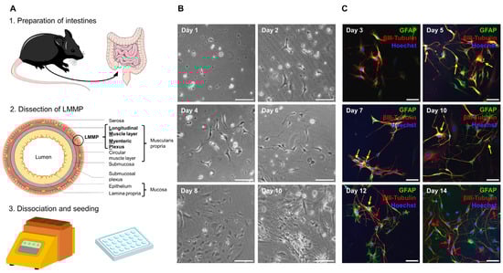 Establishment of a primary enteric nervous system culture. (A) Complete intestine from duodenum to rectum was removed, cleared of feces, and rinsed. Pieces that were 2–4 cm in length were threaded onto a glass rod and incised longitudinally. Then, the outer longitudinal muscle layer with attached myenteric plexus (LMMP) was dissected. LMMP was digested with collagenase and trypsin using the Miltenyi gentleMACSTM Octo Dissociator with heaters. Cells were plated onto coated coverslips in a 24-well plate. The figure was partly generated using Servier Medical Art, provided by Servier, licensed under the Creative Commons Attribution 3.0 Unported license. (B) Cells began to adhere after 24 h. After 2 d, processes began to form and grow before cells started proliferating at approximately day 8. On day 10, a stable network had formed. Scale bars represent 100 µm. (C) Cells in culture expressed the marker proteins glial fibrillary acidic protein (GFAP) and βIII-tubulin. Immediately after culture preparation, few neuronal cells could be detected (red arrows). From day 5 onward, cells expressing both markers were visible (yellow arrows). From day 10 onward, coexpression decreased and more neuronal cells were detected. Scale bars represent 50 µm. ENS = enteric nervous system, GFAP = glial fibrillary acidic protein, LMMP = longitudinal muscle layer with attached myenteric plexus.