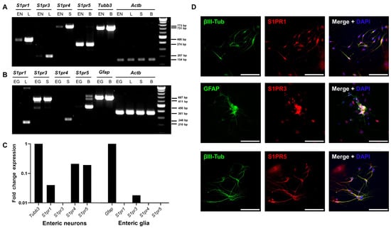 Next, we evaluated the expression of S1pr1, S1pr3, S1pr4, and S1pr5 using reverse transcribed cDNA from pure enteric neuronal or glial cell lines. Analysis using qualitative reverse transcription polymerase chain reaction (RT-PCR) revealed the expression of S1pr1, S1pr4, and S1pr5 by enteric neurons (Figure 3A). In contrast, enteric glial cells expressed S1pr3 (Figure 3B). These results were confirmed by quantitative real-time polymerase chain reaction (qRT-PCR; Figure 3C). Similar results were obtained at the protein level using the primary ENS cell culture system. Antibody staining revealed that S1PR1 and S1PR5 colocalized with βIII-tubulin. Antibody staining revealed that S1PR3 colocalized with GFAP (Figure 3D).