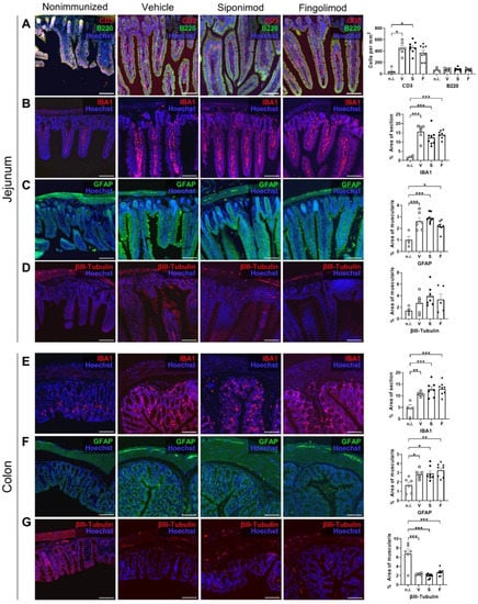 Staining of the colonic ENS revealed few lymphocytes residing in the LP. Therefore, no further analysis of CD3/B220 staining was performed. Differences between nonimmunized and immunized mice were evident for IBA1 and GFAP in a similar pattern (Figure 4E,F). Although 4.60% ± 1.53% of the IBA1+ area was present in nonimmunized mice, this value increased to 10.74% ± 0.36% (p = 0.0091) in vehicle-, 12.75% ± 1.24% (p = 0.0004) in siponimod-, and 12.88% ± 0.97% (p = 0.0003) in fingolimod-treated mice. GFAP values increased from 1.67% ± 0.32% for muscularis area in nonimmunized mice to 2.85% ± 0.21% (p = 0.04) in vehicle-, 2.94% ± 0.29% (p = 0.02) in siponimod-, and 3.26% ± 0.26% (p = 0.002) in fingolimod-treated mice. Finally, staining for βIII-tubulin revealed a significant decrease in the positively stained area in MP4-immunized mice; 6.78% ± 1.02% of muscularis area stained positive in nonimmunized mice compared with 2.30% ± 0.08% (p < 0.001) in vehicle-, 1.94% ± 0.19% (p < 0.001) in siponimod-, and 2.67% ± 0.25% (p < 0.001) in fingolimod-treated mice (Figure 4G). Taken together, enterogliosis was observed in both the jejunum and colon, accompanied by pronounced T cell infiltration into the jejunal LP and neuronal loss in the colonic myenteric plexus in chronic EAE. However, no significant differences in CD3, B220, IBA1, GFAP, and βIII-tubulin staining were present between the treatment groups.