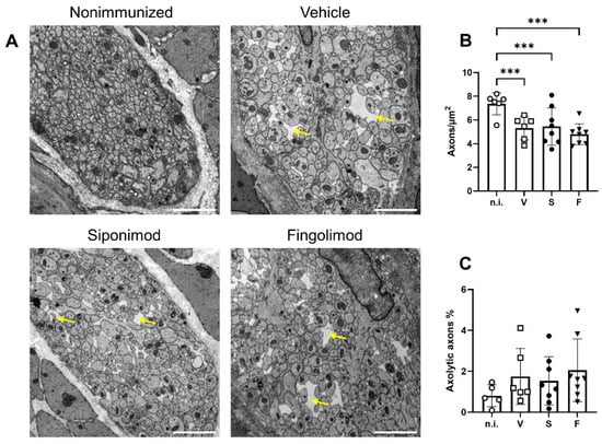 Analysis of the myenteric plexus in the colon of MP4-immunized mice using transmission electron microscopy. (A) Representative images of each treatment group in 10,000× magnification. Scale bars represent 2 µm. Yellow arrows indicate edematous gaps. (B) Quantification of the number of axons/µm2. (C) Quantification of the percentage of axolytic axons. Statistical analysis was performed using two-way ANOVA. *** p < 0.001. n.i. = nonimmunized, V = vehicle, S = siponimod, F = fingolimod, ANOVA = analysis of variance.