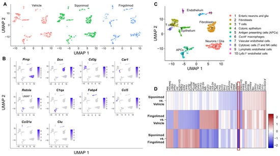 We performed single-cell RNA sequencing (scRNA-seq) of LMMP single cell suspensions from animals treated with vehicle, siponimod, or fingolimod. A total of 10 cell clusters could be distinguished in the integrated data set at a clustering resolution of 0.2. The clusters contained cells from all three conditions at comparable proportions (Figure 6A). Using a set of marker genes (top one is shown in Figure 6B) expressed by most cells of a certain cluster, and not expressed by most cells in the other clusters, different clusters could be identified (Figure 6C). Cluster 1 contained enteric neurons and glial cells. Cluster 2 contained fibroblasts, clusters 3 and 8 contained different subsets of T cells and natural killer cells. Cluster 4 contained colonic epithelial cells. Clusters 5 and 6 contained professional antigen presenting cells (APCs), while clusters 7, 9, and 10 contained endothelial cells. Because the aim of the study was to determine the potential neuroprotective role of siponimod, we focused our analysis on cluster 1. To this end, the top differentially expressed genes were analyzed between treatment groups. We defined a threshold of >|1.5| as differentially expressed, indicating that all genes with a log2 fold change (logFC) of >1.5 or <−1.5 were genes of interest, when there was also statistical significance with an adjusted p-value of < 0.05. In cluster 1 (Figure 6D), only one gene passed this threshold: Dcn, transcribing for the proteoglycan decorin, which is expressed by the extracellular matrix of many tissues and plays important roles in the protection against cancer [35]. Dcn was downregulated in the siponimod- compared with the fingolimod-treated group, with a logFC of −1.78. Compared to vehicle, both groups showed similar changes in Dcn expression, but in opposite directions, which was below the threshold. Siponimod-treated mice showed a downregulation of Dcn expression (logFC = −0.78), while fingolimod-treated mice showed an upregulation of Dcn expression (logFC = 1.00).
