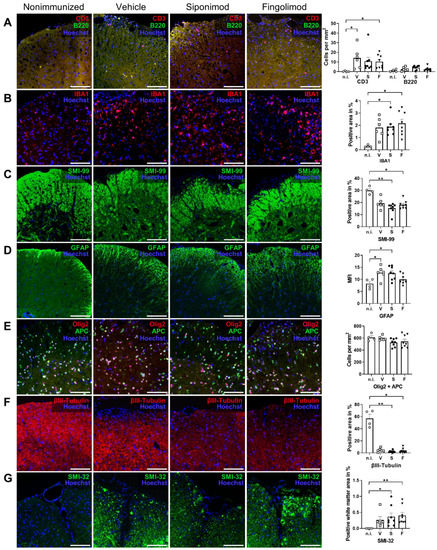 Next to the ENS, we examined CNS pathology in nonimmunized compared with MP4-immunized and treated mice. We focused on the spinal cord because of the prominent pathology observed in this region in MP4-induced EAE [36]. First, the pathology was examined with light microscopy. To this end, IHC staining for neuronal, glial, and immunological markers was performed. EAE mice showed a significantly higher number of infiltrating T cells in the spinal cord compared with nonimmunized mice. Only 0.25 ± 0.25 cells/mm2 were present in nonimmunized mice. This number increased to 14.2 ± 4.48 (p = 0.018) in vehicle-, 10.8 ± 4.1 (p = 0.053) in siponimod-, and 10.4 ± 2.48 T (p = 0.045) in fingolimod-treated mice (Figure 7A). Consistent with the results obtained from the intestine, B cell infiltration was absent; however, the number of IBA1+ cells increased in MP4-immunized mice. Compared to 0.29% ± 0.05% of the IBA1+ spinal cord area in nonimmunized mice, this number increased to 1.81% ± 0.33% (p = 0.09) in vehicle-, 1.88% ± 0.25% (p = 0.046) in siponimod-, and 2.15% ± 0.34% (p = 0.014) in fingolimod-treated EAE mice (Figure 7B). Anti-MBP antibody (clone SMI-99) staining for demyelination revealed fulminant pathology of the anterolateral white matter (Figure 7C). Quantification revealed a decrease by one-third of the MBP+ area in EAE mice (19.24% ± 1.76% (p = 0.30) positively-stained spinal cord area in vehicle-, 15.35% ± 1.43% (p = 0.004) in siponimod-, and 18.10% ± 1.21% (p = 0.046) in fingolimod-treated mice) compared with nonimmunized controls (29.91% ± 1.48%). Moreover, immunization induced reactive astrogliosis, shown by an increase in the GFAP+ area. The GFAP+ spinal cord area was 12.74% ± 1.07% (p = 0.037) in vehicle-, 12.54% ± 0.98% (p = 0.036) in siponimod-, and 9.98% ± 0.70% (nonsignificant) in fingolimod-treated mice compared with nonimmunized mice, which had 8.20% ± 1.00% GFAP+ area (Figure 7D). Furthermore, no differences between the treatment groups were observed in the number of Olig2/adenomatous-polyposis-coli (APC) double-positive cells (Figure 7E). Olig2 is an oligodendrocyte-specific transcription factor expressed at all stages of oligodendrocyte development, and APC is a tumor suppressor that is transiently expressed during myelination and remyelination [37]. Nonimmunized mice had 609.6 ± 28.7 Olig2/APC double-positive cells/mm2. Vehicle-, siponimod-, and fingolimod-treated EAE mice displayed 596.5 ± 14.7, 527.0 ± 23.8, and 544.8 ± 37.4 cells/mm2, respectively. βIII-tubulin staining revealed severe neuronal loss in MP4-immunized mice. In nonimmunized mice, 57.03% ± 6.84% of the spinal cord area stained positive for βIII-tubulin; however, in vehicle-, siponimod-, and fingolimod-treated mice, these values were 4.60% ± 1.26% (non-significant), 2.45% ± 0.61% (p = 0.010), and 3.59% ± 1.38% (p = 0.017), respectively. SMI-32 is a monoclonal antibody against the nonphosphorylated neurofilament heavy chain, which is expressed by pyramidal neurons, but is also detected in damaged axons [38,39]. Chronic MP4-immunized mice showed a significant increase in white matter SMI-32 staining (0.27% ± 0.10% (non-significant) in vehicle-, 0.37% ± 0.12% (p = 0.026) in siponimod-, and 0.40% ± 0.10% (p = 0.01) in fingolimod-treated mice) compared with nonimmunized mice (0.0005% ± 0.0004%) (Figure 7G). Taken together, IHC analysis revealed a pronounced pathology with light microscopy in the lumbar spinal cord of EAE mice. However, no statistically significant differences were observed between the treatment groups.