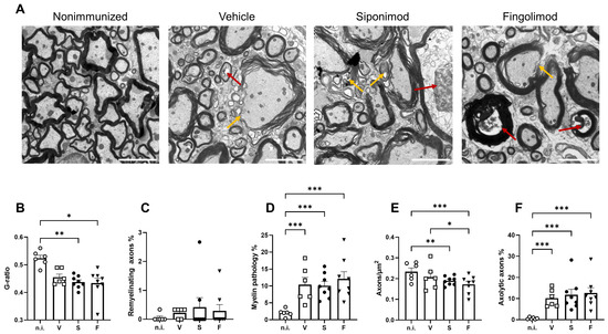 Moreover, we examined the spinal cord at the ultrastructural level. The numbers of normal axons, axons undergoing axolysis (Figure 8A, red arrows), and axons with a pathology or without the myelin sheath were quantified (Figure 8A, yellow arrows). In addition, we determined the value of the g-ratio, which is defined as the ratio between the area of the axon divided by the area of the nerve fiber (axon + myelin sheath). The value of the mean g-ratio in nonimmunized mice was calculated. A range defined as mean ± three standard deviations was considered “normal”. Nerve fibers with g-ratio values below or above the threshold were classified as demyelinating or remyelinating, respectively. EAE mice showed a significantly lower g-ratio than nonimmunized mice (Figure 8B, compare 0.52 ± 0.011 in nonimmunized mice to 0.46 ± 0.011 (p = 0.11) in vehicle-, 0.44 ± 0.008 (p = 0.004) in siponimod-, and 0.43 ± 0.018 (p = 0.014) in fingolimod-treated mice). No difference between treatment groups was observed indicating no effect of siponimod or fingolimod beyond spontaneous remyelination (Figure 8C). EAE mice displayed significantly more axons with a pathology or without the myelin sheath. Although nonimmunized mice had 2.04% ± 0.44% of such axons, this value increased to 10.39% ± 2.17% (p < 0.001) in vehicle-, 10.06% ± 1.28% (p < 0.001) in siponimod-, and 12.11% ± 2.12% (p < 0.001) in fingolimod-treated mice (Figure 8D). Moreover, less axons/µm2 were observed in some groups. Nonimmunized mice displayed a mean number of 0.23 ± 0.02 axons/µm2 in the myenteric plexus. In vehicle-, siponimod-, and fingolimod-treated mice, these numbers were 0.21 ± 0.02, 0.19 ± 0.01 (p = 0.004), and 0.17 ± 0.01 (p < 0.0001) axons/µm2, respectively (Figure 8E). The percentage of axolytic axons increased from 0.64% ± 0.20% in nonimmunized mice to 10.19% ± 1.68% (p < 0.001) in vehicle-, 11.79% ± 2.63% (p < 0.001) in siponimod-, and 12.61% ± 2.58% (p < 0.001) in fingolimod-treated mice (Figure 8F).