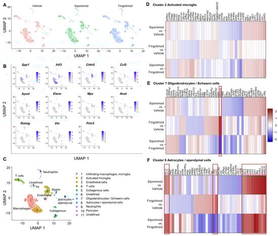 We next performed scRNA-seq from single cell suspensions of mechanically and enzymatically digested spinal cord. With a clustering resolution of 0.1, we could differentiate 11 cell clusters in the integrated data of all three treatments. The experimental conditions were evenly distributed between the clusters (Figure 9A). Using the top marker genes (top one is shown in Figure 9B), we could identify 9 clusters (Figure 9C). Clusters 1 and 2 contained microglial subsets. Clusters 3 and 10 contained endothelial cells. T cells were present in cluster 4, whereas collagenous connective tissue constituted cluster 5. Clusters 6 and 11 could not be identified and contained only low numbers of cells. Cluster 7 contained myelinating cells, including oligodendrocytes and Schwann cells. Astrocytes and ependymal cells were present in cluster 9, whereas cluster 10 contained pericytes. We focused on glial cell clusters 2, 7, and 8 to evaluate the neuroprotective effects of siponimod. In cluster 2, no gene passed the threshold value of logFC >|1.5| (Figure 9D). In cluster 7, S100a9 was strongly upregulated in the fingolimod- compared with the vehicle-treated group (logFC = 2.02; Figure 9E). However, there was no change in expression in the siponimod-treated group compared with the vehicle-treated group (logFC = 0.19). S100a9 encodes S100A9 or calprotectin, which is a proinflammatory calcium- and zinc-binding protein that is upregulated in the serum of patients with MS [40]. In cluster 8, 14 differentially expressed genes passed the threshold (Figure 9F). The logFC values are shown in Table 2.