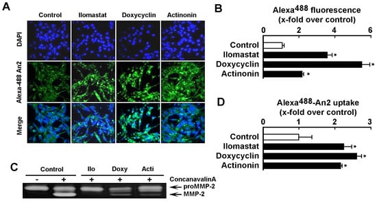 Inhibition of MMP catalytic activity leads to increased An2 intracellular internalization. (A) U87 glioblastoma cells were cultured on cover slips, treated with broad-range MMP inhibitors Ilomastat (10 µM), Doxycycline (25 µM) or Actinonin (25 µM) for 24 h in serum-depleted media, incubated with 100 nM of Alexa488-An2 for 18 h, fixed and counterstained with DAPI (in blue) to visualize the nuclei. Photomicrographs were taken using confocal microscopy (20X magnification) and (B) fluorescence (in green) quantified with ImageJ software. Quantification represents the ratio of the mean green fluorescence per cell. Fluorescence measurements are from four fields taken from a representative experiment performed out of two. (C) U87 glioblastoma cells were treated as in (A) in combination with 30 µg/mL of Concanavalin-A. Samples from the conditioned media were harvested to perform gelatin zymography in order to assess the extent of MT1-MMP-mediated proMMP-2 activation. (D) Intracellular uptake assay of An2 was performed as described in the Section 4 with 100 nM Alexa488-An2 for 18 h in the presence or not of the above MMP inhibitors. Uptake measurements are triplicates from a representative experiment performed out of two. Probability values of less than 0.05 were considered significant and an asterisk (*) identifies such significance in the figures.