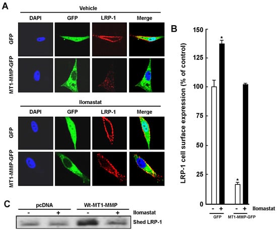 In order to confirm the link between MT1-MMP’s catalytic activity and its ability to alter the LRP-1-mediated An2 internalization process, we sought to evaluate MT1-MMP’s ability to shed LRP-1 from the cell surface []. U87 glioblastoma cells were transiently transfected with a Mock vector (GFP) or a cDNA encoding the full-length Wt-MT1-MMP-GFP recombinant protein, and then cells were treated with vehicle or Ilomastat. Transfection efficacy was confirmed by visualizing GFP- or Wt-MT1-MMP-GFP-fluorescent cells (Figure 5A, green). LRP-1 cell surface immunolabelling was performed (Figure 5A, red) and, when quantified in green, fluorescent cells, found to be decreased in cells overexpressing Wt-MT1-MMP-GFP (Figure 5B, white bars). Ilomastat significantly prevented that decrease and was also found to increase LRP-1 cell surface expression by 37% in control GFP-transfected cells (Figure 5B, black bars). This observation correlates with data on An2 internalization (Figure 3D) and strengthens the involvement of the MMP-mediated catalytic processes. LRP-1 cell surface shedding into the culture media was also measured to validate the hypothesis that LRP-1 is shed from the cell surface through MT1-MMP-mediated proteolytic activity. Conditioned media were harvested and concentrated. Increased expression of MT1-MMP-mediated LRP-1 immunoreactive cleavage product of ~250 kDa was observed in cells overexpressing recombinant MT1-MMP, whereas this shedding was decreased in Ilomastat-treated cells (Figure 5C). These results in part explain how MT1-MMP cell surface expression/function status may reduce the efficacy of LRP-1-mediated An2 internalization in brain cancer cells.