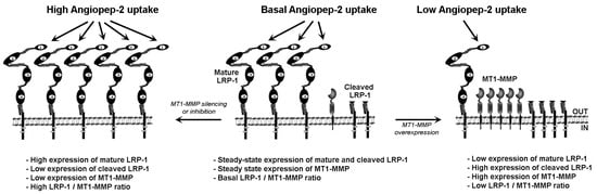 LRP-1/MT1-MMP expression ratio dictates An2 internalization capacity. Scheme summarizing the functional impact on the An2 intracellular internalization process of a high LRP-1/MT1-MMP ratio obtained through MT1-MMP silencing or pharmacological inhibition (left, high An2 uptake), a basal LRP-1/MT1-MMP ratio (middle, basal An2 uptake), and a low LRP-1/MT1-MMP ratio (right, low An2 uptake).