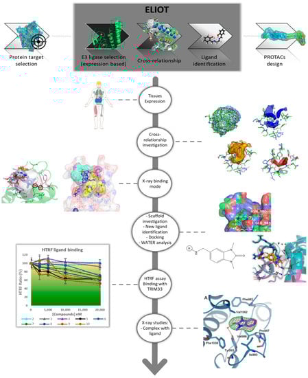 Palomba, T.; Tassone, G.; Vacca, C.; Bartalucci, M.; Valeri, A.; Pozzi, C.; Cross, S.; Siragusa, L.; Desantis, J. Exploiting ELIOT for Scaffold-Repurposing Opportunities: TRIM33 a Possible Novel E3 Ligase to Expand the Toolbox for PROTAC Design. Int. J. Mol. Sci. 2022, 23, 14218. https://doi.org/10.3390/ijms232214218