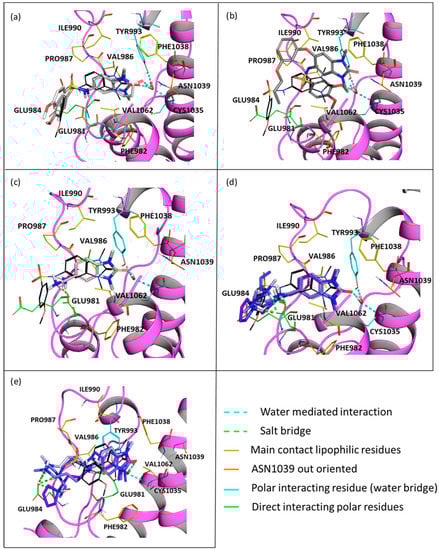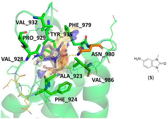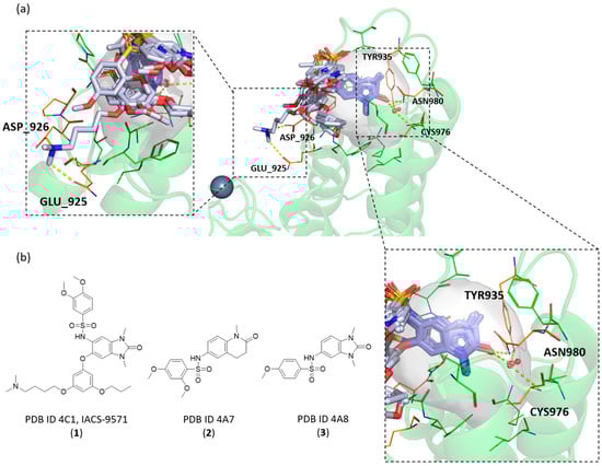 - The salt bridge with GLU981 is missing because the amide group can not establish it. Furthermore, even a possible hydrogen bond interaction between the amide and the GLU981 should not occur as at pH 7.4, the amide of the most abundant protomer (66.9%—predicted pKa = 7.19 [56]) of compounds 2 and 3 is deprotonated. Additionally, the reduced mobility due to the rigidity of the sulfonamide does not allow the correct directionality of the amide group towards the glutamic acid.