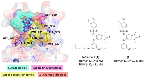 - The presence of the glutamic acid residue (GLU981) should not allow the TRIM24 compounds to fit properly in the pocket. Despite this, for compounds 2 and 3, good poses in TRIM33α were found (Figure 9a) contrary to what was previously assumed, while for compound 4, no plausible poses were obtained (Figure 9b).
