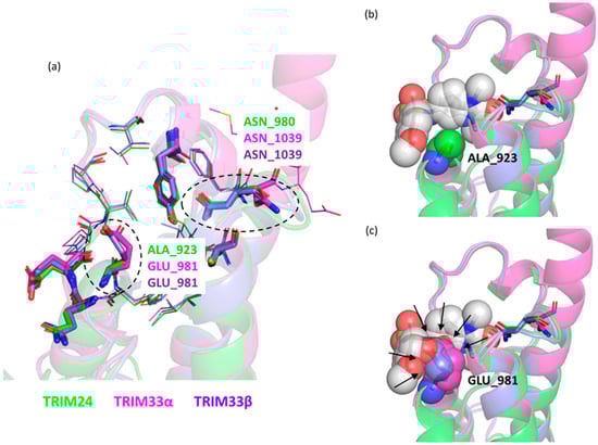 - As discussed above, after aligning the crystallographic pose of the TRIM24 ligand onto TRIM33α, it is evident how the glutamic acid residue in TRIM33α prevents the access of the ligand to the binding site. The dimethoxybenzenesulfonamide group in its TRIM24 conformation clashes with TRIM33. For this reason, during the docking process, ligands should adapt to the presence of the glutamic acid residue, but their rigidity does not allow them to assume the optimal conformation.