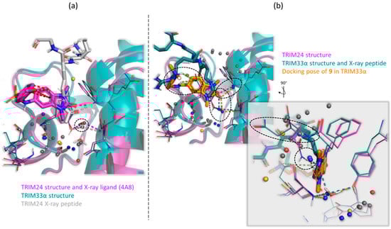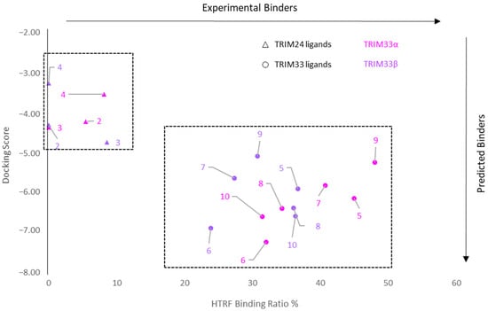 - In TRIM33α, the obtained poses for all the tested compounds replicate the reference binding mode of the X-ray ligand 3 (represented as the black wire in Figure 9).