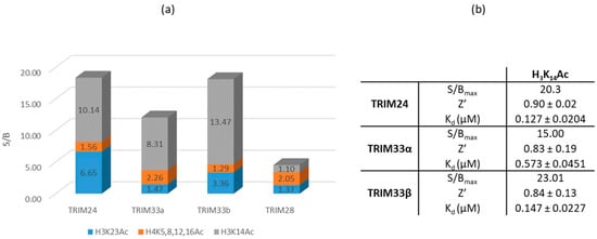 - Sekirnik, A.R.; Reynolds, J.K.; See, L.; Bluck, J.P.; Scorah, A.R.; Tallant, C.; Lee, B.; Leszczynska, K.B.; Grimley, R.L.; Storer, R.I.; et al. Identification of Histone Peptide Binding Specificity and Small- Molecule Ligands for the TRIM33α and TRIM33β Bromodomains Published. ACS Chem. Biol. 2022, 17, 2753–2768. [Google Scholar] [CrossRef]
