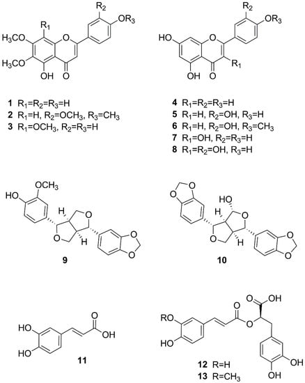 - Yang, L.-N.; Xing, J.-G.; He, C.-H.; Wu, T. The Phenolic Compounds from Dracocephalum moldavica L. Biochem. Syst. Ecol. 2014, 54, 19–22. [Google Scholar] [CrossRef]
