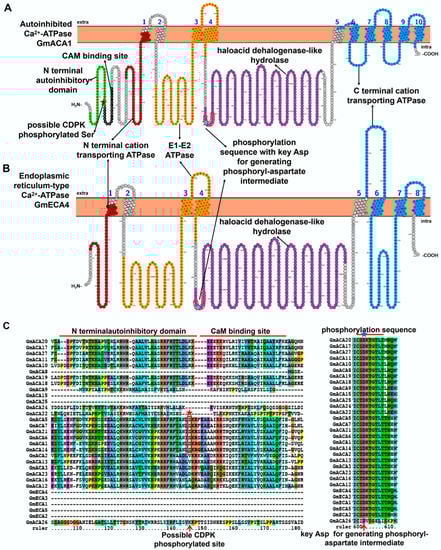 Topology model and homology analysis of soybean Ca2+-ATPase, including autoinhibited Ca2+-ATPase (ACA) (A) and endoplasmic reticulum-type Ca2+-ATPase (ECA) (B). (C) Partial protein sequences alignment of GmACA and GmECA. The red arrows indicate key residues of GmACA and GmECA. The red box in the topology model represents the conserved phosphorylation sequence in the protein sequence alignment. The red star indicates possible CDPK phosphorylated Ser, and the blue star indicates the conserved Asp in the phosphorylation sequence. These protein topology figures were constructed by using Protter []. The protein sequences were aligned by using ClustalX1.83 (http://www.clustal.org/download/, accessed on 17 October 2022).