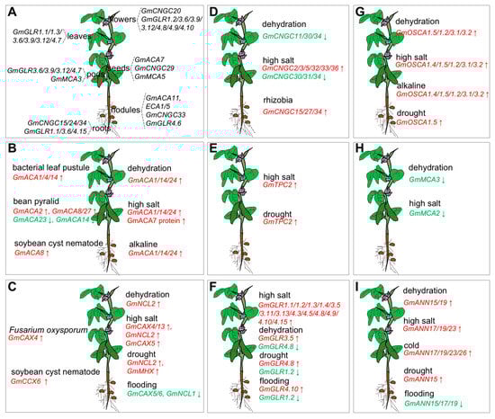 Schematic diagram of expression of eight soybean calcium transporters in soybean tissues (A) and under adverse stimuli (B–I). All these data were collected from published references. The red and upward arrows represent the elevation of expression. The green and downward arrows represent the decrease of expression.