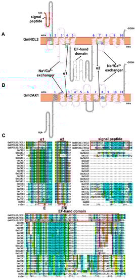 Topology model and homology analysis of soybean Ca2+/cation antiporter. (A) Topology model of Na+/Ca2+ exchanger-like (NCL). (B) Topology model of Ca2+/H+ exchanger (CAX). (C) Partial protein sequences alignment of soybean Ca2+/cation antiporter. The green box in the topology model represents the α-repeat region in the protein sequence alignment. The blue star indicates the conserved Asp or Glu in two α-repeat regions. The red arrows indicate key residues of GmCAX, GmCCX, GmEFCAX\NCL, and GmMHX. These protein topology figures were constructed by using Protter []. The protein sequences were aligned by using ClustalX1.83 (http://www.clustal.org/download/, accessed on 17 October 2022).