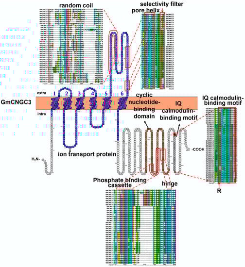 Topology model and homology analysis of soybean cyclic nucleotide-gated ion channel (CNGC). The red star indicates the conserved Arg in IQ calmodulin-binding motif. The protein topology figure was constructed by using Protter []. The protein sequences were aligned by using ClustalX1.83 (http://www.clustal.org/download/, accessed on 17 October 2022).