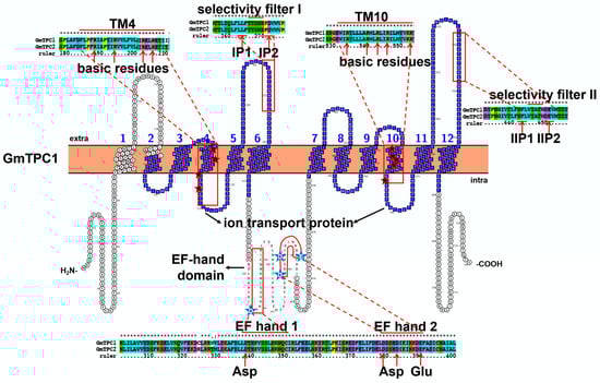 Voltage-gated ion channels contain three related topologies, including single voltage-domain channels, four-domain channels, and TPCs. TPC is a ubiquitously expressed channel protein with very few family members. Plant central vacuole is a huge Ca2+ store. Although its Ca2+ concentration varies significantly in different tissues, the free vacuolar Ca2+ content is controlled in the millimolar range. Many plants have been reported to possess the TPC gene, a tonoplast located slow vacuolar (SV) channel, and transports Ca2+ from vacuole to cytoplasm. TPC, CNGC, and GLR are the only three ion channels, which function as ligand receptors. Structurally, soybean TPCs contain 12 transmembrane domains, two ion transport domains, and two EF-hand domains (PF13499) (Figure 5 and Figure S5). Similar to CNGC, every six transmembrane domains form an ion transport domain, and a P loop lies between the fifth and sixth transmembrane domains. The first pore loop is similar to Arabidopis TPC channels (with conserved LLFTTSNNPDV motif), while the second is very different (Figure 5). The second filter motif in Arabidopsis is NLLVMGNWQVW, but NFLVTATWDEV in soybean. Since the filter residues have great influences on channel selectivity [], GmTPC may have different roles from AtTPC in ion transporting. The fourth and tenth transmembrane domains are positively charged, because of the rich basic residues Arg (Figure 5 and Figure S5). However, in the Arabidopsis TPC1 channel, the tenth transmembrane has been proved to be the major voltage-sensing site, and the roles of the fourth transmembrane in voltage sensing were found to be very few []. In the homology model, there is a long helix structure, including the sixth transmembrane and partial EF-hand domain in monomer, and GmTPC1 can form a homodimer by crossing two long helix structures (Supplementary Figure S5). Two EF-hand domains are conserved, located on the cytosolic side, and act as the linker of two ion domains. EF-hand 1 consists of DTHKVSSLNKNQC residues and is required for the channel to deal with physiological Ca2+ fluctuations. EF-hand 2 (with conserved Asp-X3-Asp-X7-Glu) operates as a Ca2+ sensor and regulates the channel open in a voltage-dependent manner when cytosolic Ca2+ binds to this site [] (Figure 5 and Figure S5).