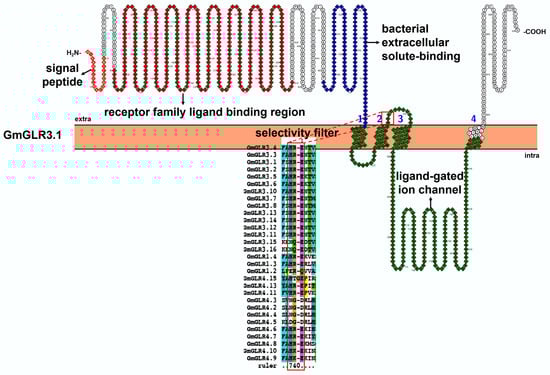 Topology model and homology analysis of soybean glutamate receptor-like (GLR). The red box in the topology model represents the conserved selectivity filter motif in the protein sequence alignment. The protein topology figure was constructed by using Protter []. The protein sequences were aligned by using ClustalX1.83 (http://www.clustal.org/download/, accessed on 17 October 2022).