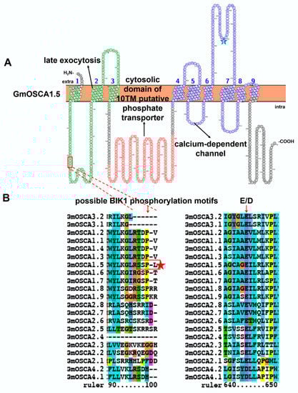 Topology model (A) and homology analysis (B) of soybean hyperosmolality-gated calcium-permeable channel (OSCA). The red box in the topology model represents the possible BIK1 phosphorylation motif, which is marked with a red box and a red star in the protein sequence alignment. The blue star indicates the conserved Asp or Glu in the calcium-dependent channel domain. The protein topology figure was constructed by using Protter []. The protein sequences were aligned by using ClustalX1.83 (http://www.clustal.org/download/, accessed on 17 October 2022).