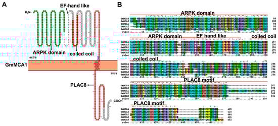 Topology model (A) and homology analysis (B) of soybean mid1-complementing activity (MCA). The protein topology figure was constructed by using Protter []. The protein sequences were aligned by using ClustalX1.83 (http://www.clustal.org/download/, accessed on 17 October 2022).