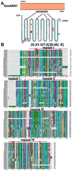 Topology model (A) and homology analysis (B) of soybean annexins antiporter (ANNs). The red arrows indicate key residues of GmANNs. The conserved residues Ala (G), Thr (T), and Glu (E) in repeats I and IV are indicated by purple, orange, and blue star, respectively. The red star indicates the conserved Trp (W), and the yellow star indicates the conserved Arg (R). The protein topology figure was constructed by using Protter []. The protein sequences were aligned by using ClustalX1.83 (http://www.clustal.org/download/, accessed on 17 October 2022).