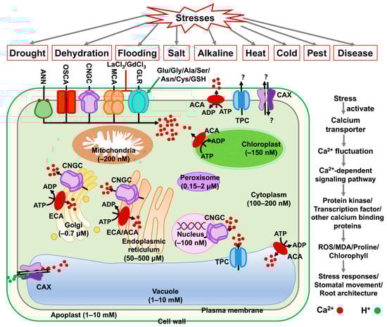 Calcium is a kind of the most versatile essential nutrients for plants. Lack of calcium in plant growth tissues results in bloom end rot, tip burn, and bitter pit []. Indeed, calcium is a multifunctional divalent cation and acts as a structural component in the cell wall and membranes, an intracellular secondary messenger, a counter-cation for inorganic and organic anions in the vacuole, and an activator of an enzyme [,,]. Mostly, they are absorbed as Ca2+ by roots and delivered to shoots via the xylem []. In plant cells, the cytosolic Ca2+ concentration is maintained at the nanomolar level, but at the millimolar level in the cell wall and vacuole [,]. However, the tiny stimulation of various outside environments would trigger intracellular Ca2+ increase within seconds/minutes []. Thus, the movement of intracellular Ca2+ needs fine regulation between extra- or intracellular storage compartments.
