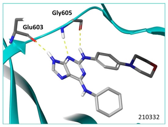 | 210332 Reversine | ![]() | −10.97 | 2 H-bonds Gly605, and 1H bond Glu603 |