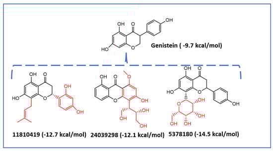 | Genistein | −9.7 | −2.9 | −4.9 | 171 | −1.2 | 76 | 0 |