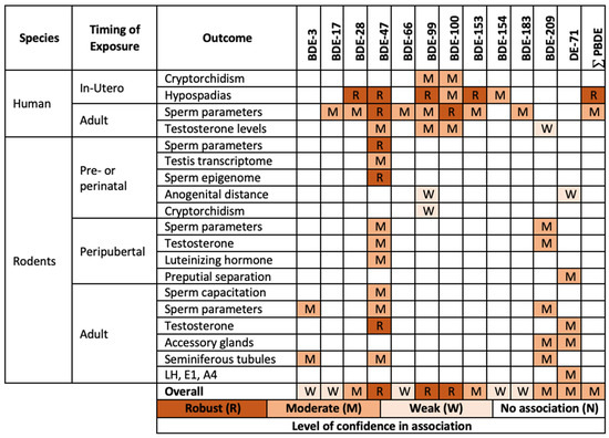 In the studies discussed above, PBDEs have been shown to have effects in the general population on various reproductive outcomes in humans, including sperm motility (BDE-28, 47, 100), sperm concentration (BDE-47, 153), total sperm count (BDE-47), sperm morphology (BDE-28, 153), cryptorchidism (BDE-99, 100, 154), hypospadias (total sum of eight PBDEs), and testes size (BDE-153) (Figure 1).