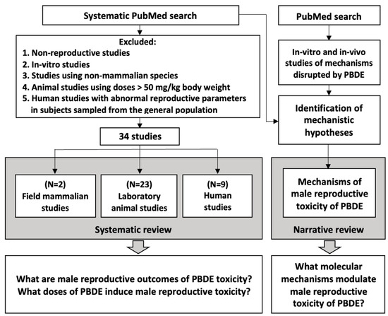 Several studies used animals to study the effects of PBDE on the male reproductive systems. Table 2 highlights the details of these studies. The developmental and adult male reproductive effects were examined separately, as in the early steps of development, xenobiotics may induce changes in morphogenic trajectories resulting in health outcomes very different from those of adult exposures.