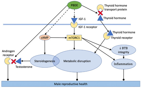 IGF-1 is another important metabolic hormone that is poorly studied both in relation to men’s reproductive health and as a target of endocrine disruption by PBDEs. Understanding of the role of the growth hormone (GH)/IGF system in human reproductive physiology started to emerge only recently [171]. IGFs participate in sexual differentiation during fetal development and promote puberty onset [172]. Lower IGF-I levels are associated with impaired sperm parameters [173].