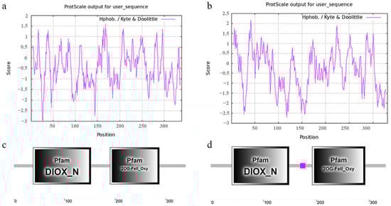 From the transcriptome data of blackberry at different developmental stages (SRA: PRJNA701162) [], we found three genes that may encode FLS proteins: one gene did not contain a verified ORF, while the other two genes are named RuFLS1 and RuFLS2. Structural analysis showed that the ORF sequences of RuFLS1 and RuFLS2 were 1017 and 993 bp in length, respectively. The physicochemical properties of RuFLS1 and RuFLS2 proteins were analyzed by ProtParam software (SIB, Geneva, Switzerland), including protein molecular weight, theoretical isoelectric point, charged residue number, instability index, fat index, and hydrophilicity (Table 1). The instability index was 36.45 and 34.70, and the instability coefficient was less than 40; thus, both proteins were considered to be stable. In addition, the total hydrophilicity of RuFLS1 and RuFLS2 was predicted to be −0.494 and −0.341 (Table 1), respectively, by ProtScale online software (SIB, Geneva, Switzerland) (Figure 1a,b), suggesting that both proteins are hydrophobic and acidic. The functional domains of RuFLS1 and RuFLS2 were predicted and found to contain a DIOX_N functional domain and a 2OG-FeII_Oxy functional domain (Figure 1c,d), indicating that they belong to the α-oxoglutarate-dependent dioxygenase family. The DIOX_N functional domain of RuFLS1 is located at amino acids 38–152, and the 2OG-FeII_Oxy functional domain is located at amino acids 190–287. The DIOX_N functional domain of RuFLS2 is located at amino acids 40–148, and the 2OG-FeII_Oxy functional domain is located at amino acids 192–292. The positions of the functional domains of different members are not exactly the same. RuFLS1 and RuFLS2 have no transmembrane region and are both extramembrane proteins.