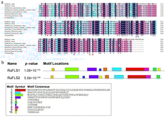 Multiple sequence alignment and motifs of FLS amino acid sequences. (a) Multiple sequence alignment of FLS amino acid sequences in different plants. (b) Conserved domains or motifs in the RuFLSs.