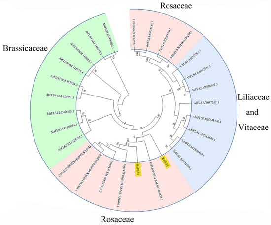 Phylogenetic tree of blackberry RuFLSs (RuFLS1 and RuFLS2) and FLS genes from other species. The rings of different colors represent different genera.