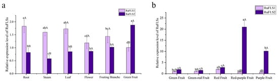 The expression pattern of the RuFLS genes in different tissues (a) and different developmental stages of blackberry fruits (b). Different lowercase letters indicate significant differences between different harvest periods (p < 0.05). Different uppercase letters represent significant differences between two RuFLS genes (p < 0.05).