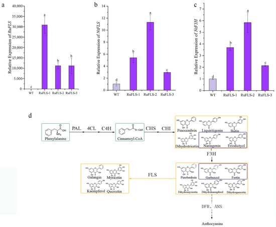 Expression patterns of flavonoid biosynthesis pathway genes in WT and RuFLS2-overexpressing tobacco. (a) RuFLS2 gene; (b) NtFLS gene; and (c) NtF3H gene. Significant differences between means (p < 0.05) are indicated by lowercase letters (a, b, c and d) above the bars. (d) Biosynthetic pathway of flavonoid compounds in blackberry. WT represents wild-type tobacco (Nicotiana tabacum cv. Wisconsin 38). RuFLS2-1, RuFLS2-2 and RuFLS2-3 represent three different transgenic tobacco lines.